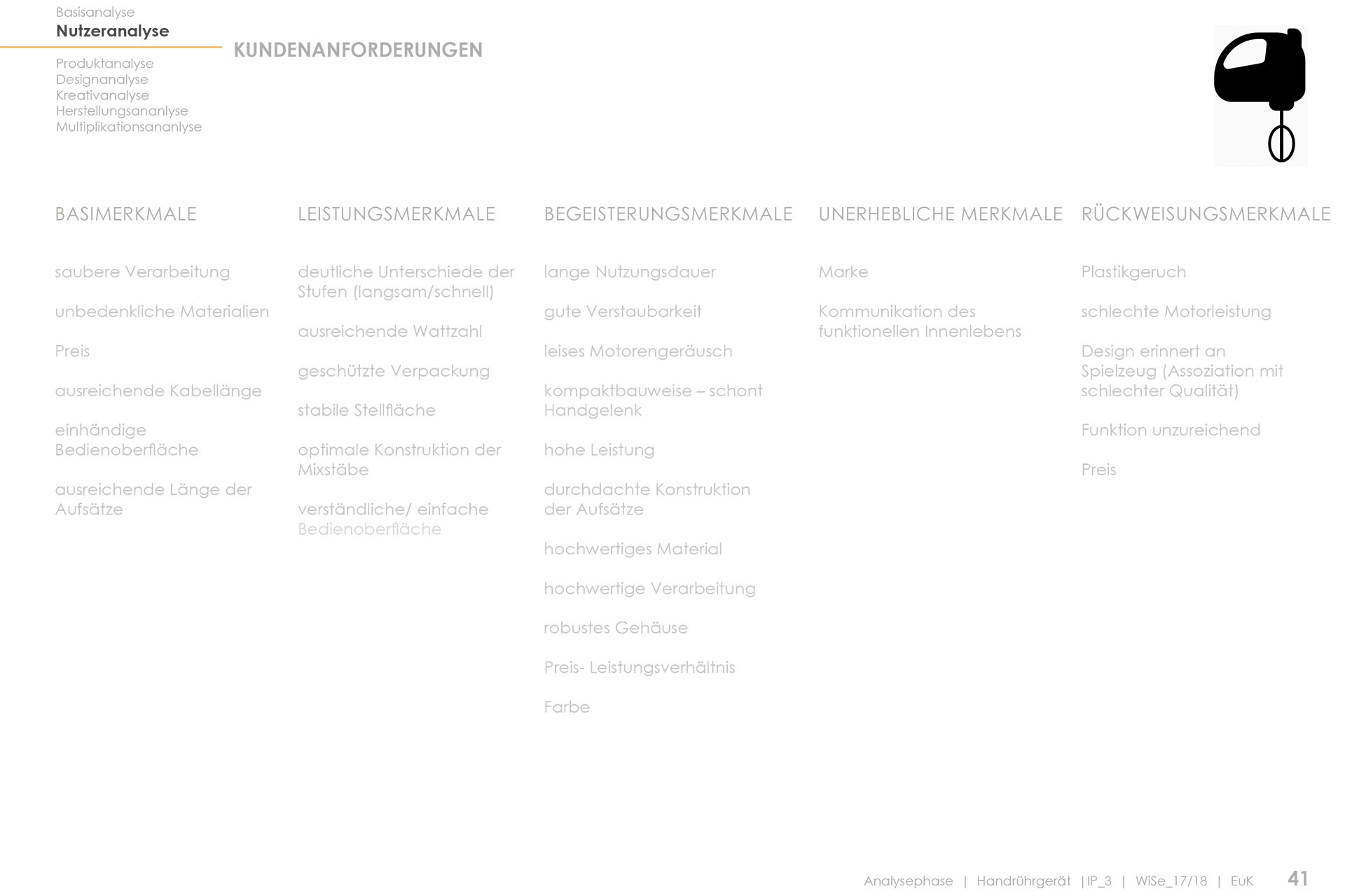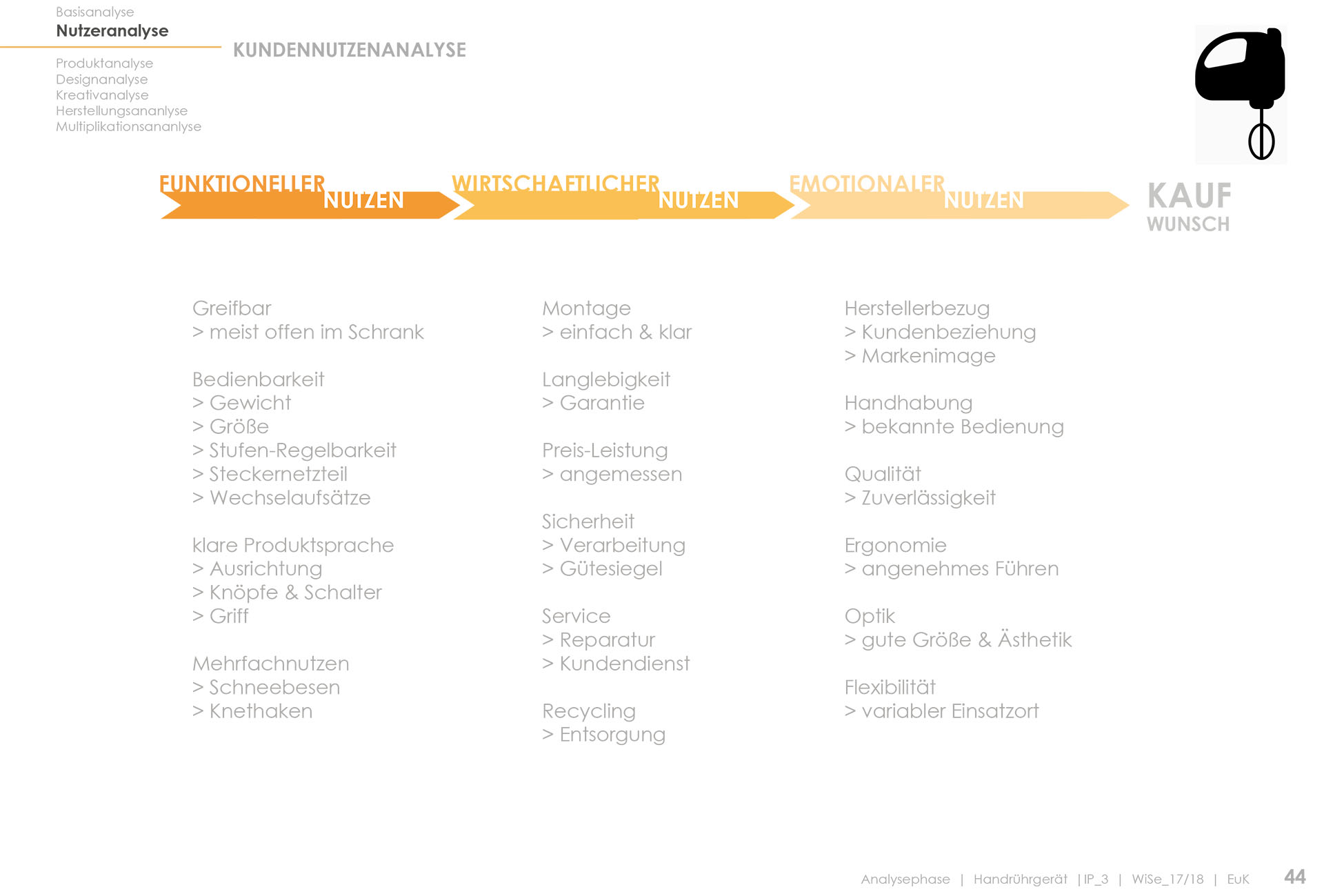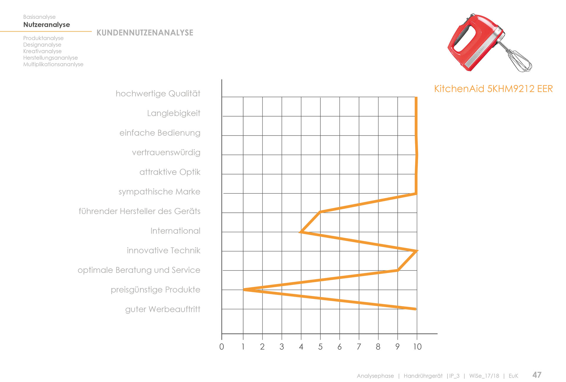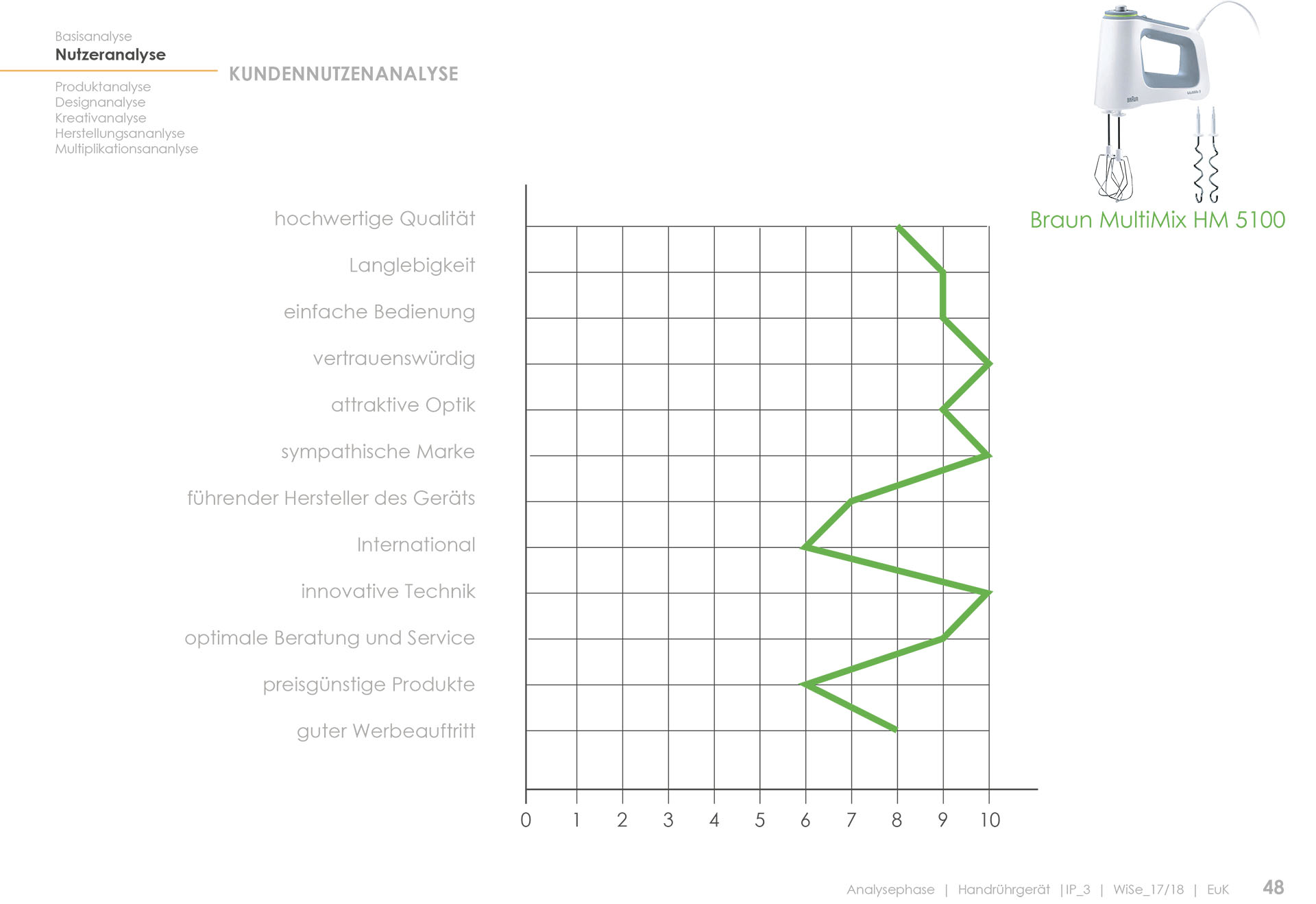 Die Analyse bezieht sich nach expliziten Kriterien auf das physische Produkt, dessen Qualität und Funktionalität, der Flexibilität des Produkts bzgl. dessen Verwendung und Anwendbarkeit, den technischen Richtlinien, des Eco-Potenzials, dem Preis-Leistungs-Verhältnis, dem Vertrieb, dem Service der dem Kauf vor- und nachgelagert ist, der Entsorgung, dem Joy-of-Use, Reparierbarkeit und auch der Entsorgung.