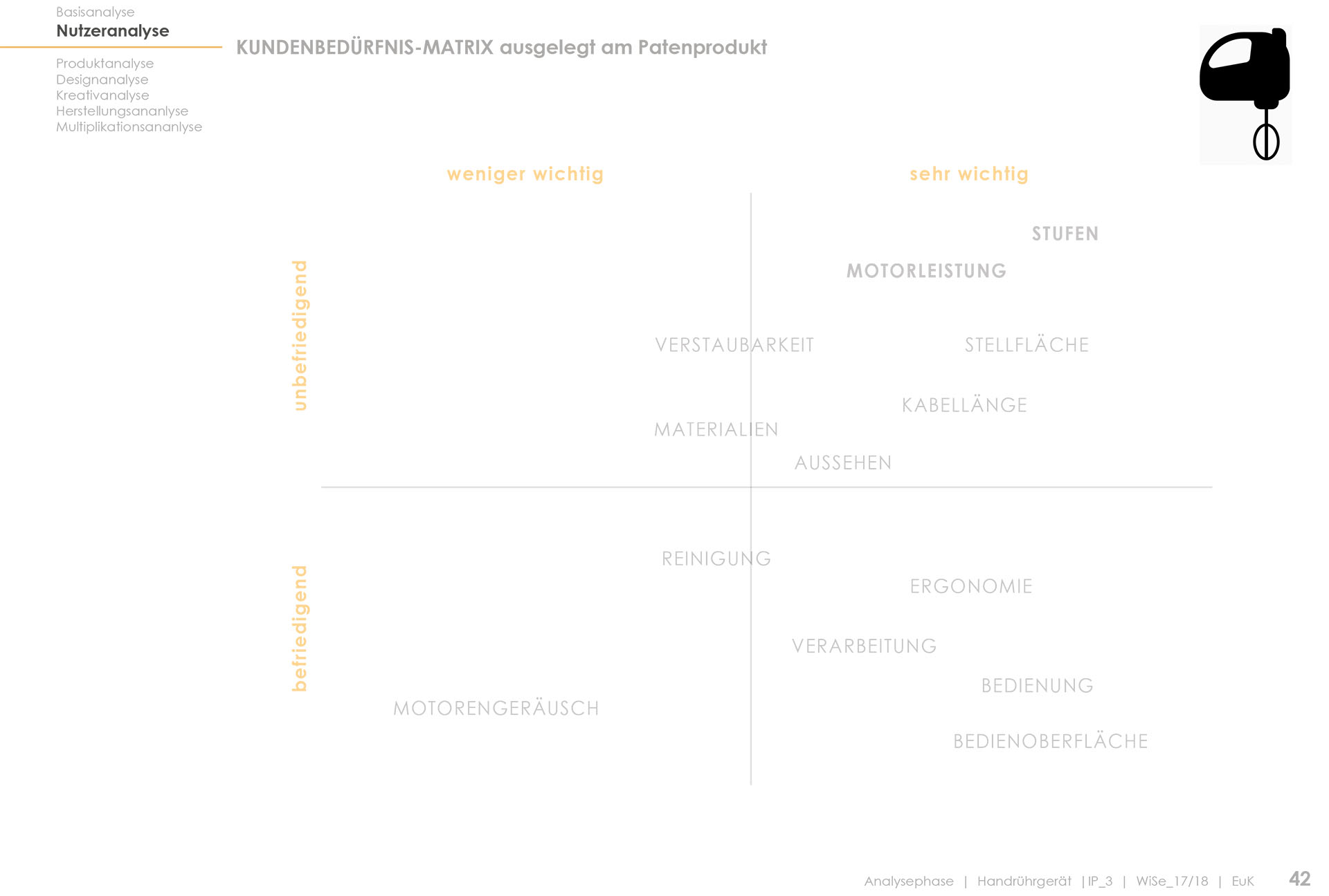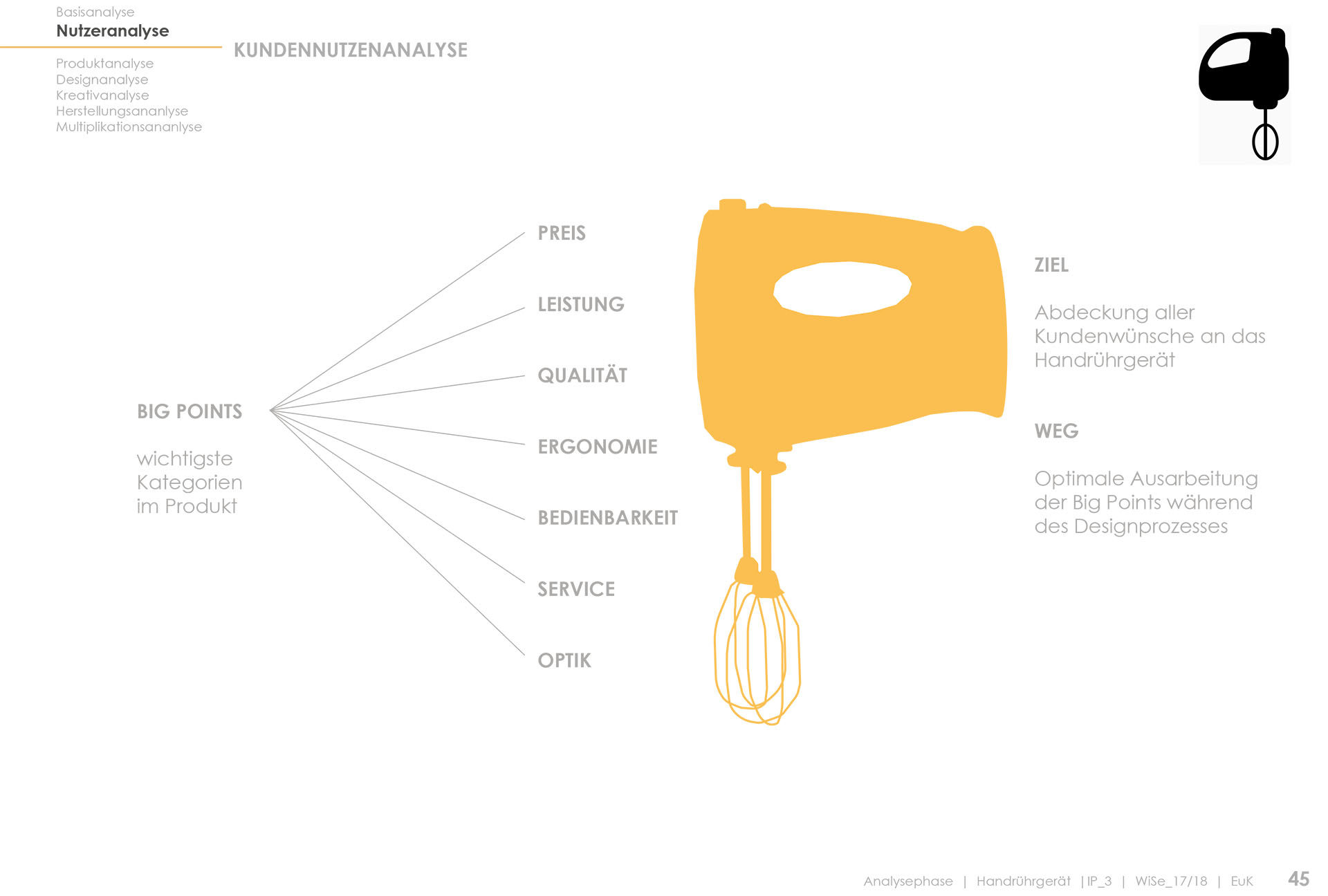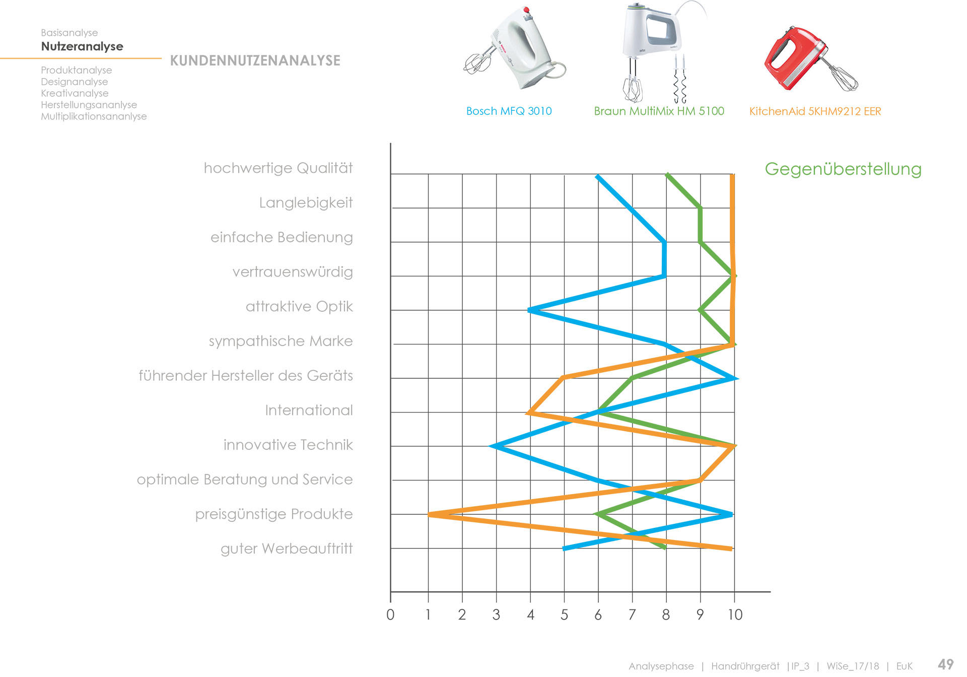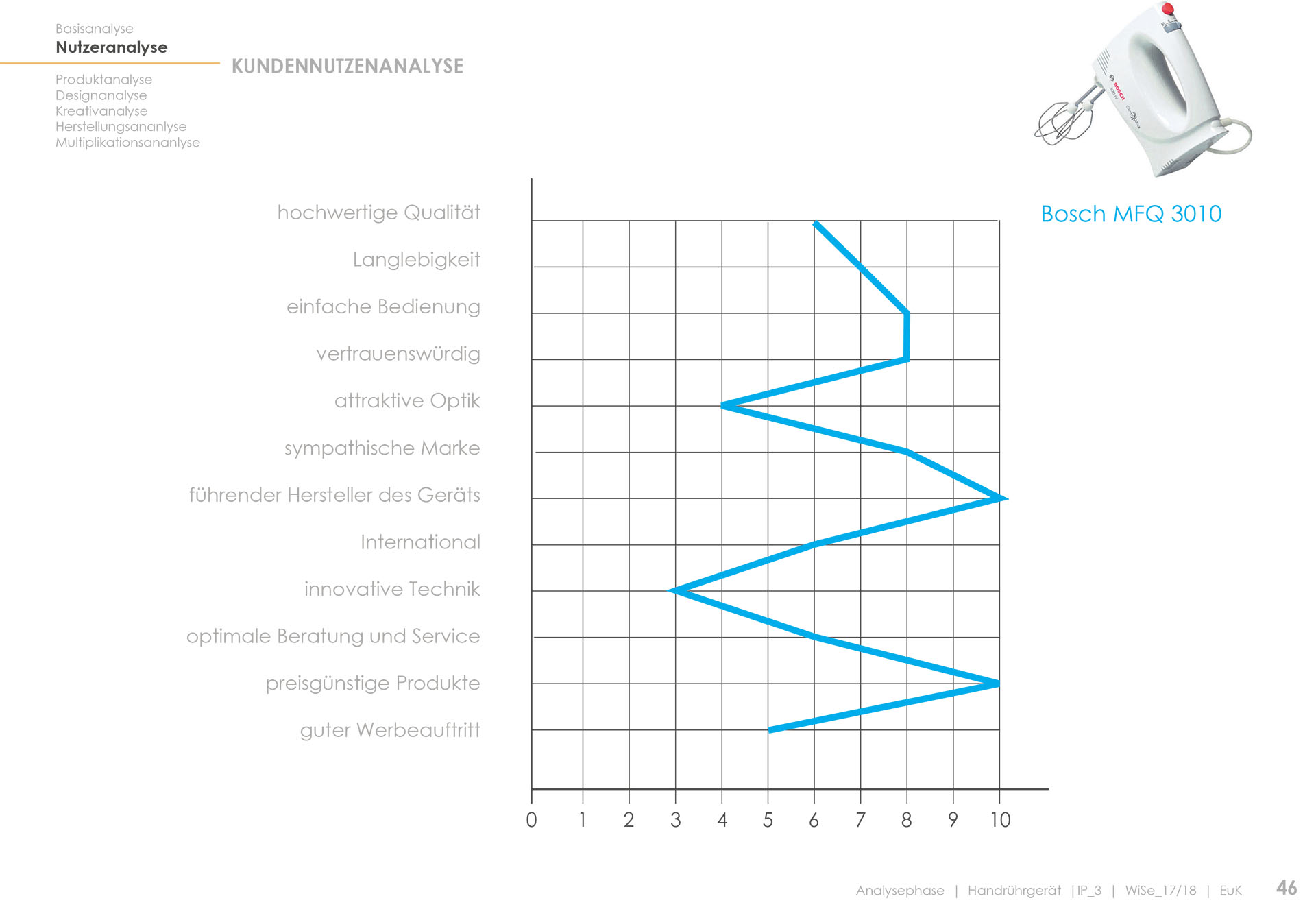 Die Analyse bezieht sich nach expliziten Kriterien auf das physische Produkt, dessen Qualität und Funktionalität, der Flexibilität des Produkts bzgl. dessen Verwendung und Anwendbarkeit, den technischen Richtlinien, des Eco-Potenzials, dem Preis-Leistungs-Verhältnis, dem Vertrieb, dem Service der dem Kauf vor- und nachgelagert ist, der Entsorgung, dem Joy-of-Use, Reparierbarkeit und auch der Entsorgung.