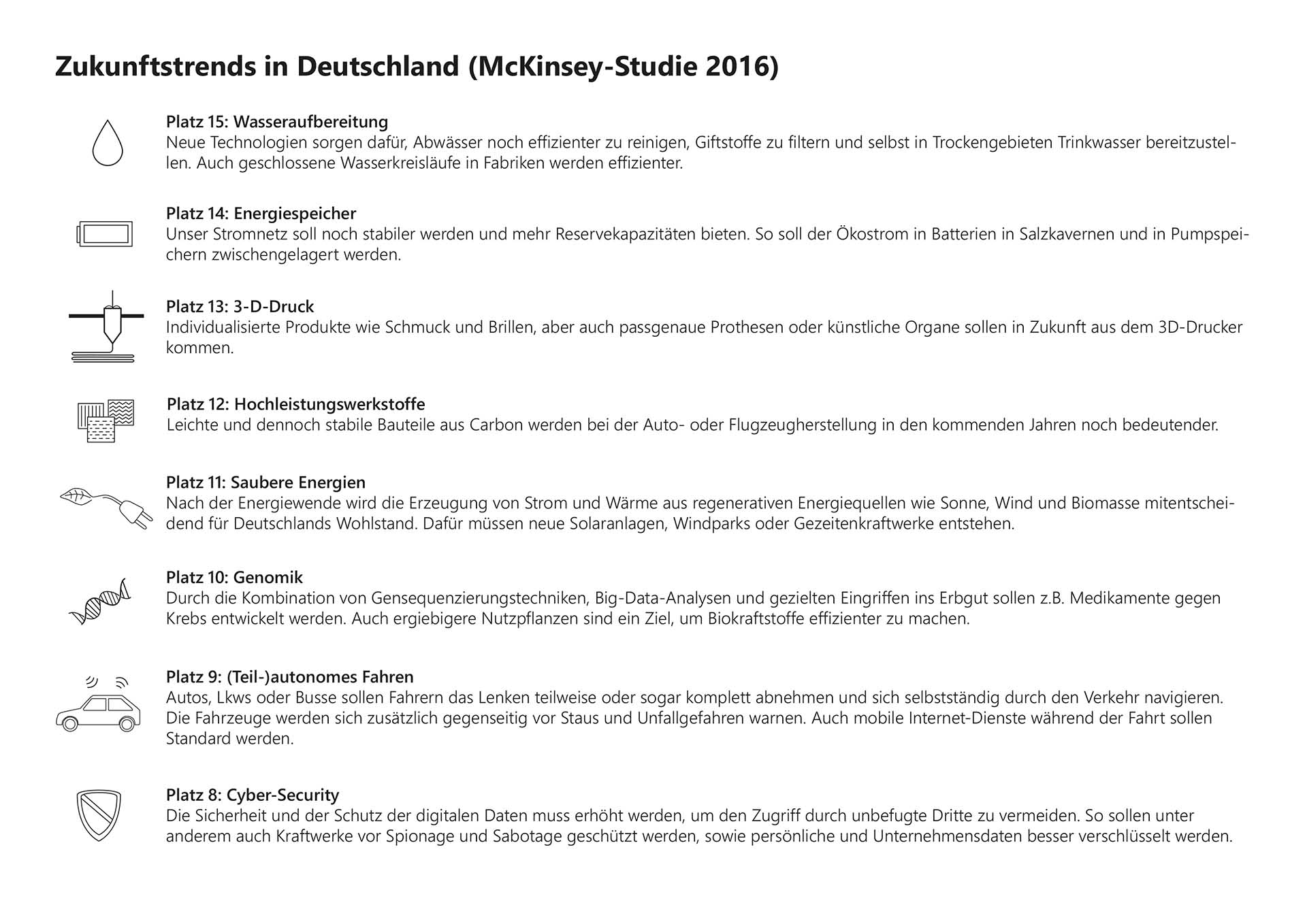 Schlüsseltechnologien sind beispielsweise Informations-, Kommunikations- und Organisationstechnologien, die mit der (Mobil-) Telekommunikationstechnik und Computertechnik einhergehen. Auch die Bereiche Nano- und Neurotechnik, Bio- und Gentechnik sowie (regenerative) Energietechniken und Kreativindustrie zählen dazu. (1)