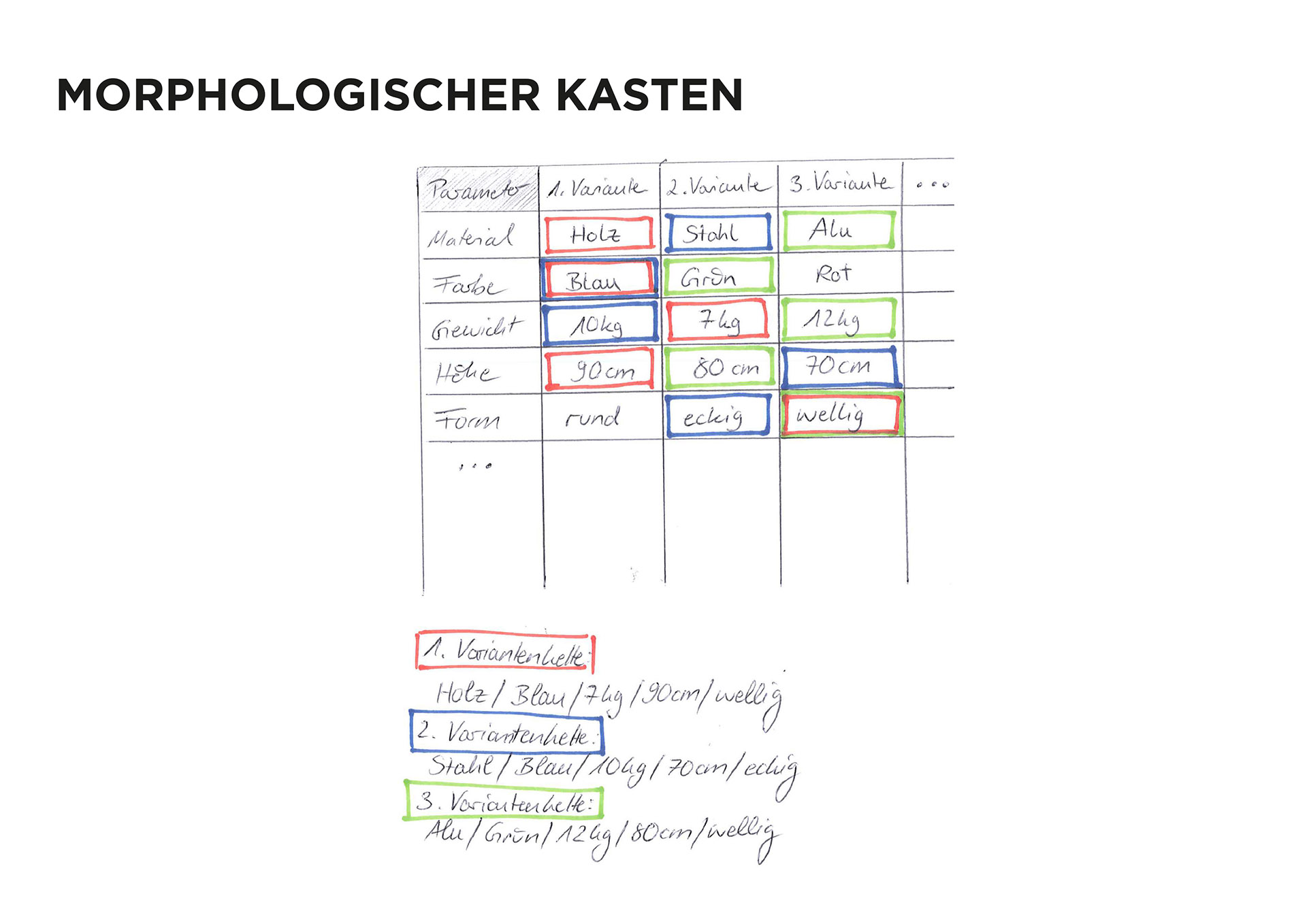 Die Kreativitätstechnik, die auf der Erstellung eines Morphologischen Kastens (zu deutsch etwa Lehre der Form/Gestalt) basiert, leistet im Entwurfsprozess dahingehend Hilfestellung, dass komplexe Aufgaben, Herausforderungen oder Problemstellungen innerhalb einer Tabelle in einzelne Parameter oder gestaltbare Bausteine zerlegt werden, die nach Bearbeitung wieder zu ganz unterschiedlichen Lösungsansätzen kombiniert werden können.