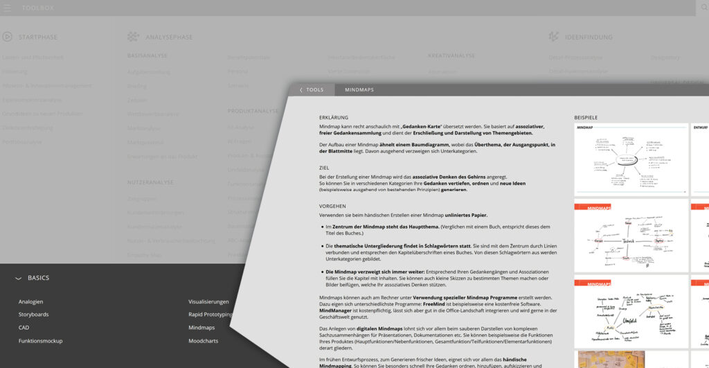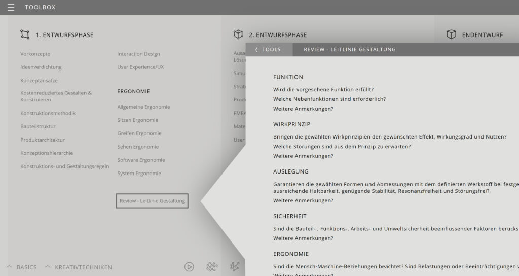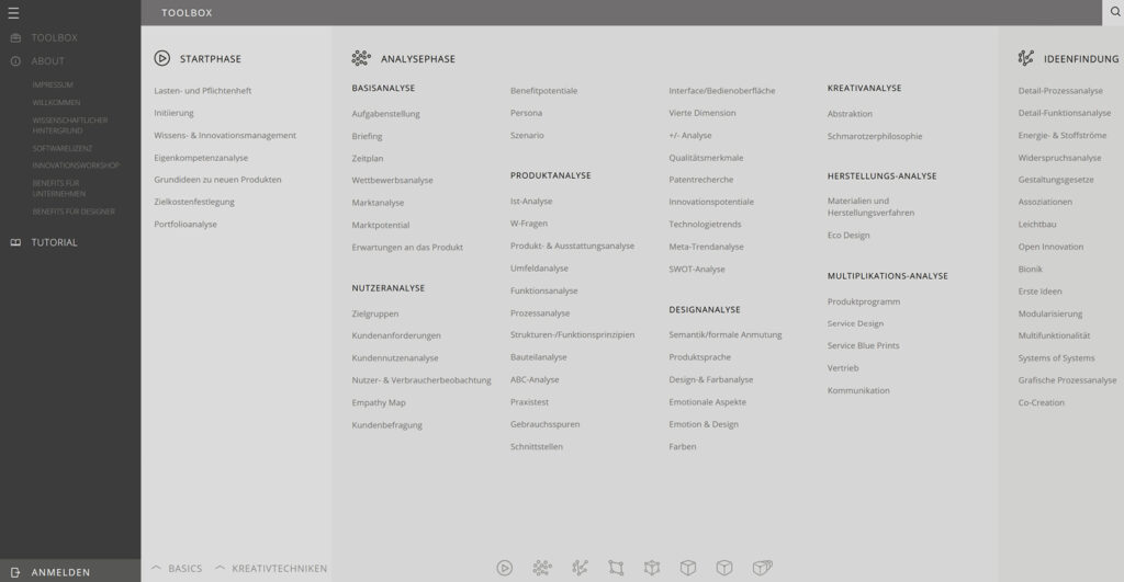 Über 180 TOOLs sind organisiert nach 8 Phasen des Designprozesses angelegt und umfassen Bereiche von der Aufgabenstellung über Marktforschung, ersten Entwürfen und Prototypen bis zur effizienten Realisierung.