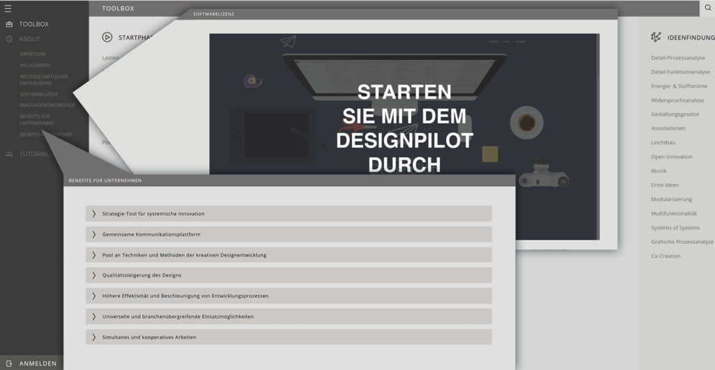 Der DESIGNPILOT ist ein digitaler „Co-WorkingSpace“ zur Implementierung von Designmethoden in interdisziplinäre Entwicklungsprozesse.